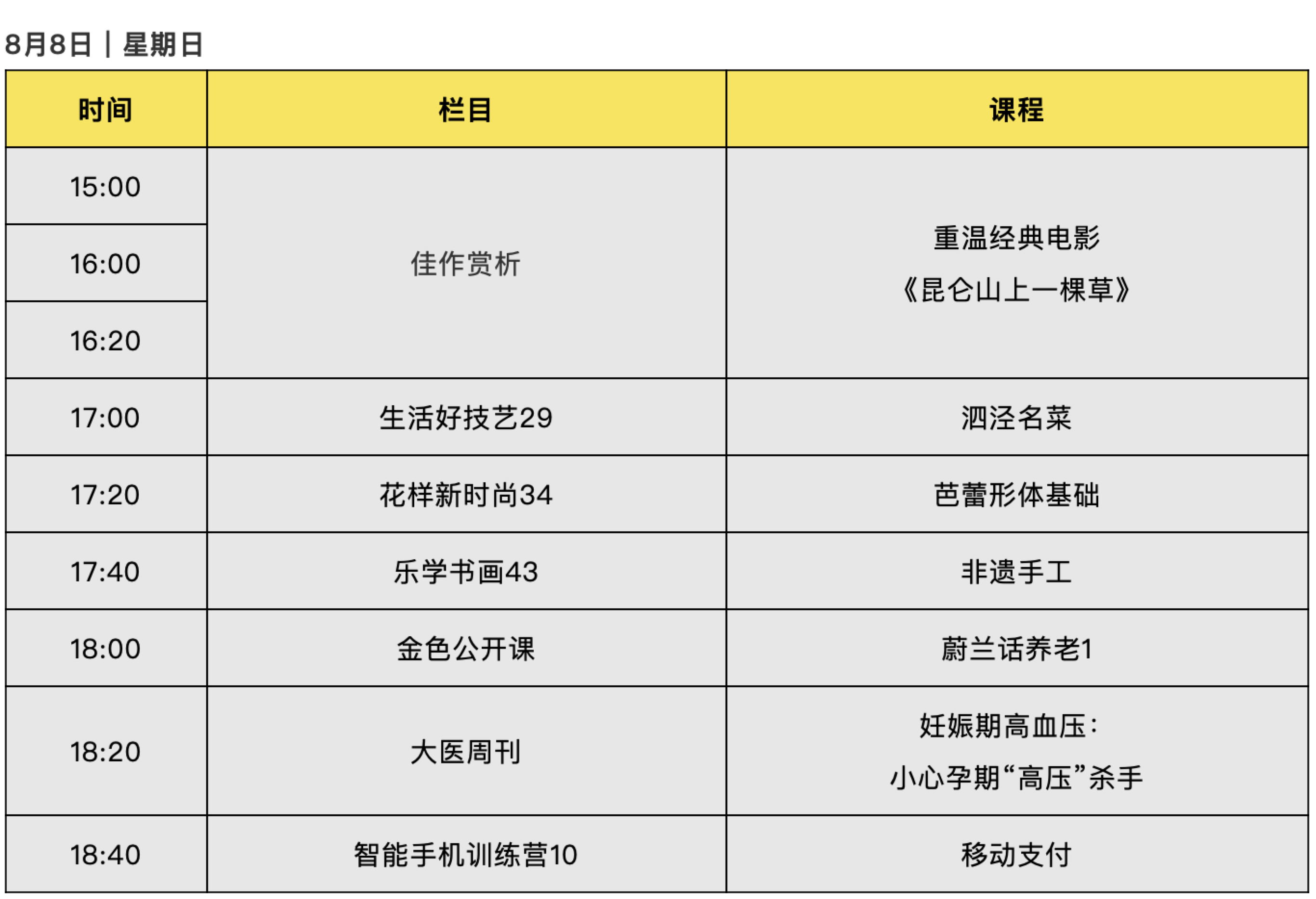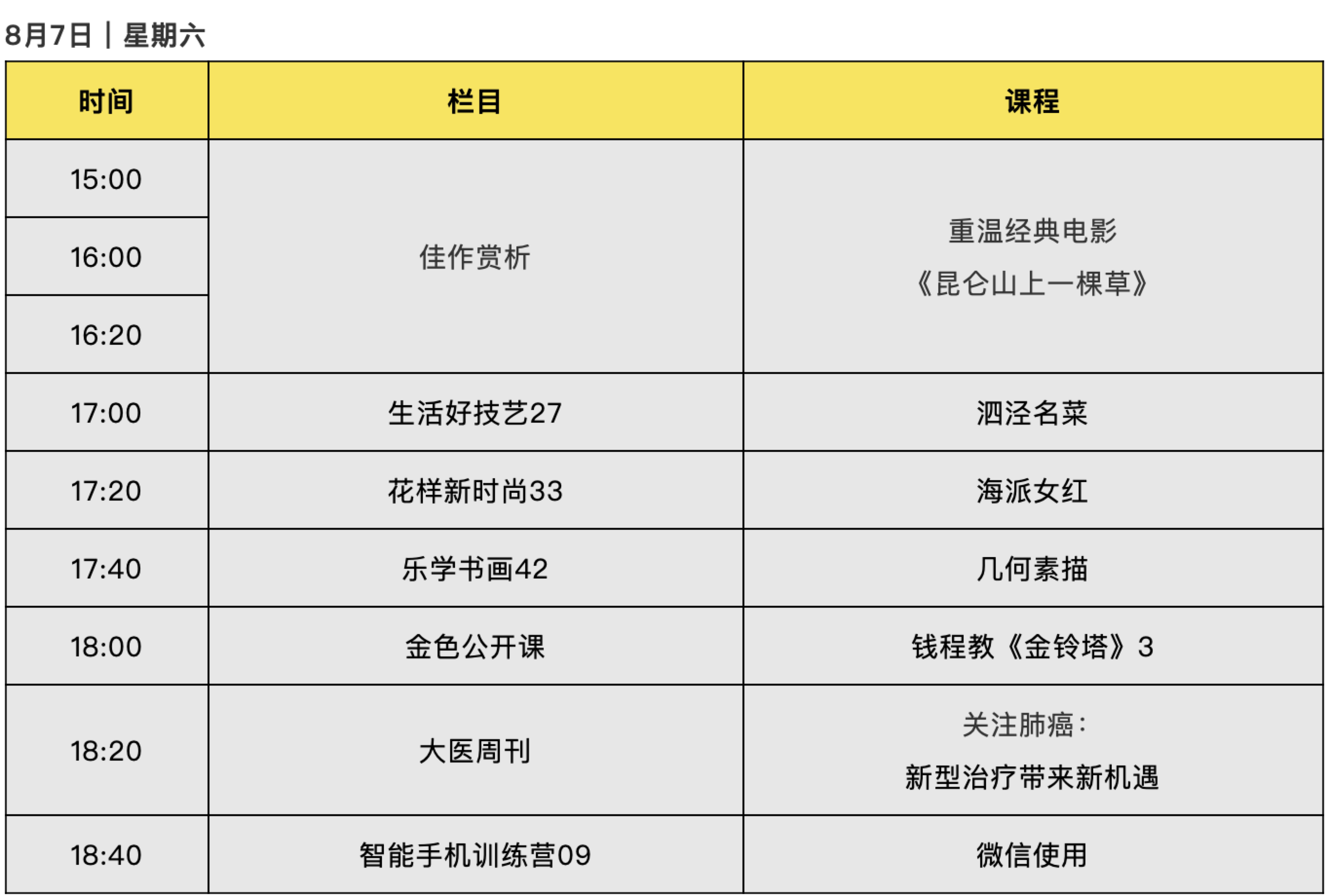 此外,金色学堂频道本周末课程表请记得为爸妈收藏!上海滑稽剧团表演艺术家钱程及全国广播金话筒奖得主、上海广播电台主持人蔚兰将带来《金铃塔》教唱和养老话题讲座;《芭蕾形体基础》邀请来自上海小白鸽老年舞蹈学院的老师传授舞艺。