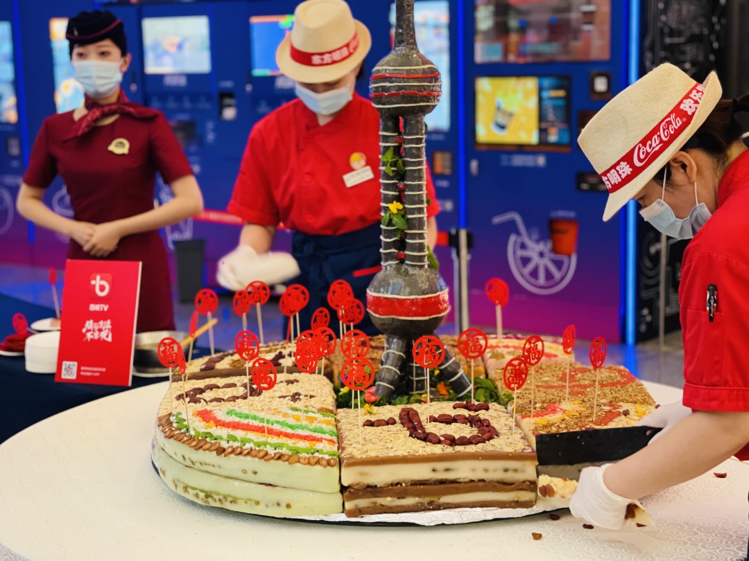 在东方明珠电视塔零米大厅分会场,上海老年大学和小荧星“大手牵小手”绘画活动、可口可乐餐厅烘培等丰富多彩的展示在此举行。