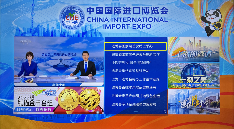 同时我们还在百视通IPTV开设“进博好物”专区,品类覆盖食品饮料、家居百货、美妆个护、母婴用品、珠宝首饰等多个垂类。