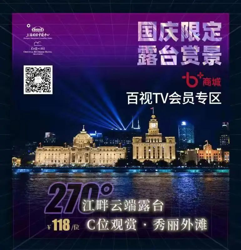 上海国际会议中心东方滨江大酒店为百视TV会员准备了多款国庆福利——房券、自助餐券、百视TV会员免费抽;4款涵盖酒店+景点、酒店+餐饮的组合产品已率先登陆百视TV B+商城;1-7日,国际会议中心还将在11楼露台开辟B+会员专属区域,尽览浦江两岸美景。
