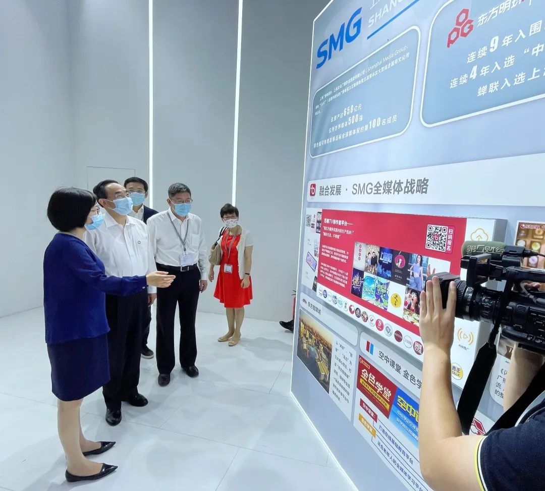 图为中宣部、上海市委宣传部领导视察本届文博会上海广播电视台、上海文化广播影视集团有限公司(SMG)、东方明珠新媒体展台