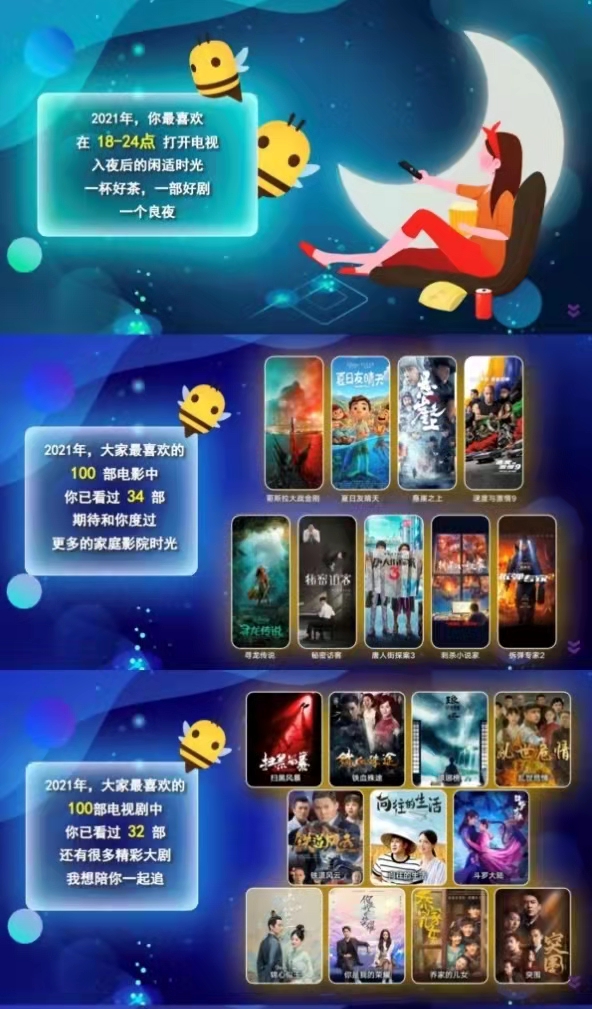 这项功能在百视通合作的三家运营商IPTV首页同步上线,用户在开机页点击报告专区,就能查看自己2021年全年的收视情况总结,这也是全国IPTV平台首次上线用户个性化收视报告。