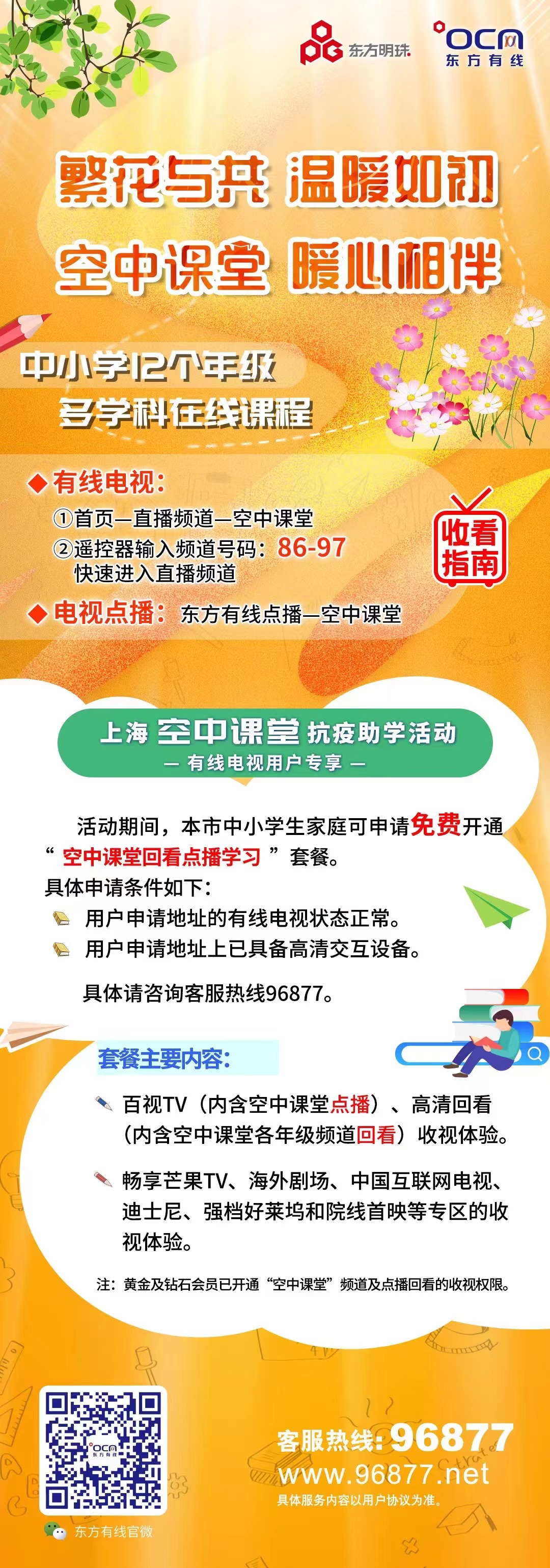 限免期间,原已推出的“上海空中课堂抗疫助学”活动仍然有效,符合条件的本市中小学生家庭可免费开通“空中课堂回看点播学习套餐”。针对封闭小区,东方有线启动“无接触服务”项目,各驻点加班加点梳理业务操作流程,指定专人对无接触服务用户进行电话指导,确保流程各环节畅通。所有和“空中课堂”相关的安装单、报修单均增加明显标识,优先响应。东方有线客服热线96877保持24小时运营,并增加了电话外呼坐席数量,以提升电话接听率。
