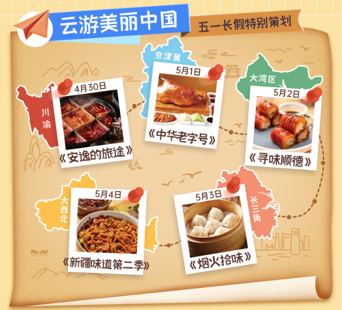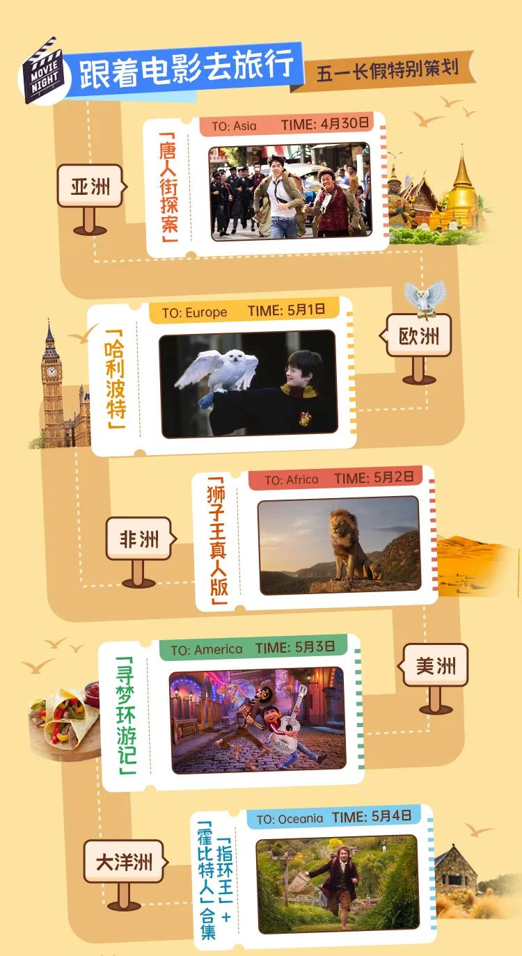 小长假期间一起【云游美丽中国】,带你领略川渝美食和大西北的独特味道。横跨南北,连贯东西,云游也能很精彩!享受完美丽中国的特色风味后来到【跟着电影去旅行】,跟着《唐人街探案》感受东南亚风情,在《哈利波特》中体验欧洲的魔法学院……总有一处异域风景能吸引你。