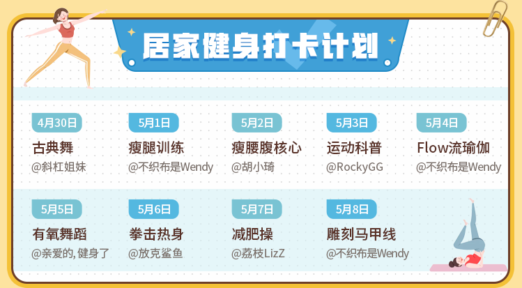 愉快的假期,也要多运动保持身体健康哦!百视TV【居家健身打卡计划】“7+7”为期两周的训练计划每天一个创作者和训练项目为了即将到来的夏天,努力逆袭吧!