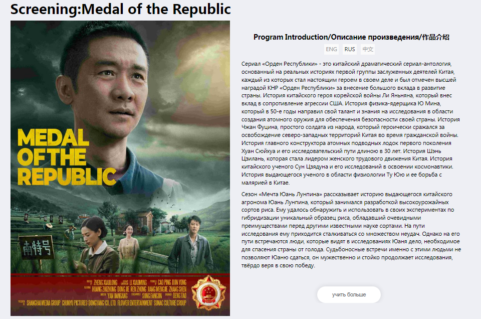 5月10日,重大现实题材电视剧《功勋》专场展映会登陆俄罗斯WCM线上展会官方平台。《功勋》是一部取材于首批八位“共和国勋章”获得者真实故事的单元剧,本次展映会选取其中的《袁隆平的梦》单元,讲述了杂交水稻之父袁隆平如何心心念念为解决中国人民乃至世界人民的温饱问题,几十年不懈探索和奋斗的故事。为了能够让海外观众,尤其是俄罗斯观众更好地欣赏这部精品剧,中国联合展台将该单元的第一集制作了俄语配音和英文字幕两个版本,同时在WCM线上展会的英语和俄语两个网站展示。