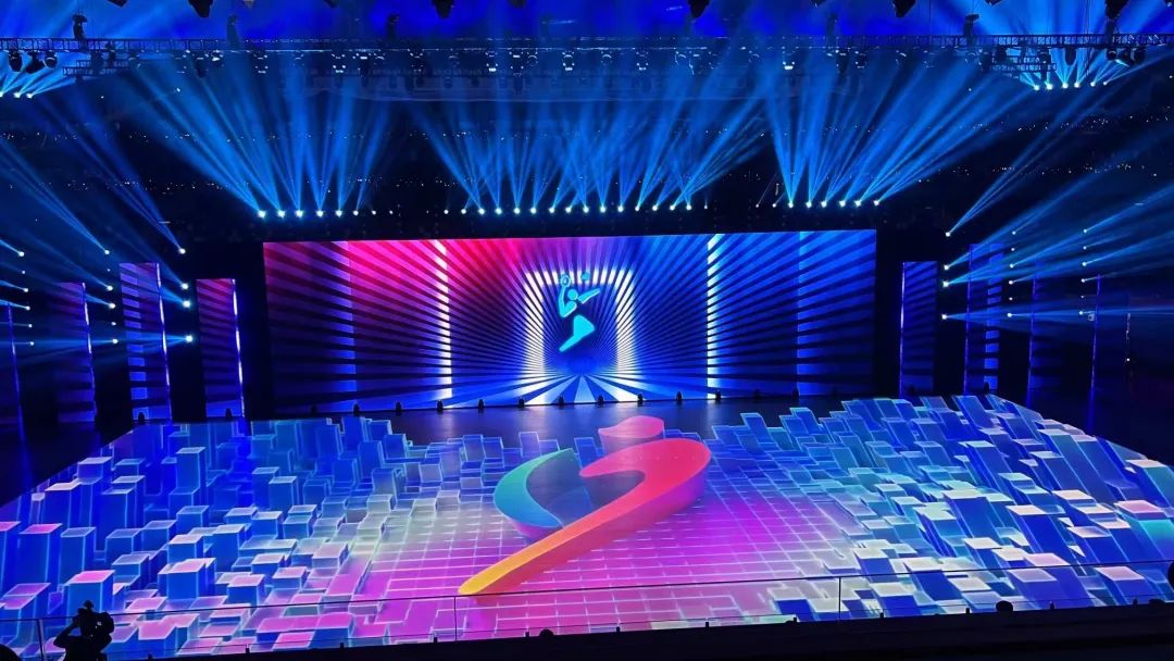 场景设计以大屏、纱幕结合地面的投影,搭配全方位灯光设计,彰显大气、宏伟的整体视觉,针对不同节目的表演变幻不同的功能效果,让观众身临其境感受本届市运会的青春朝气与阳光活力。