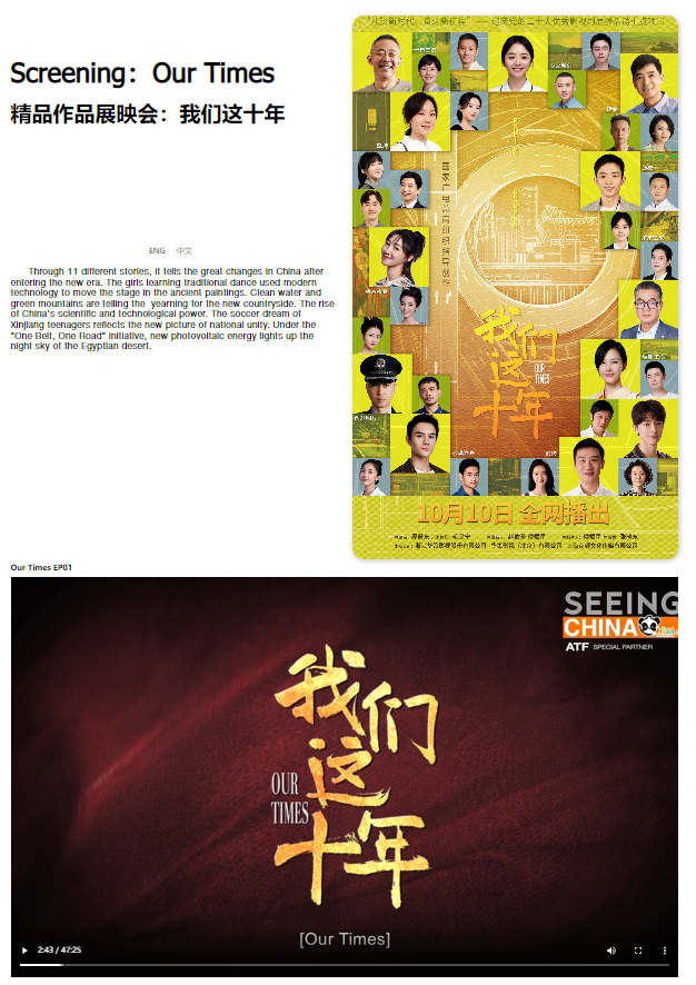 值得一提的是,今年中国联合展台还为国家重点剧目《我们这十年》举办了专场展映会,充分展示了党的十八大以来,中国共产党领导下新时代中国特色社会主义的辉煌成就,展现了人民群众获得感、幸福感、安全感、自豪感不断增强的美好历程。