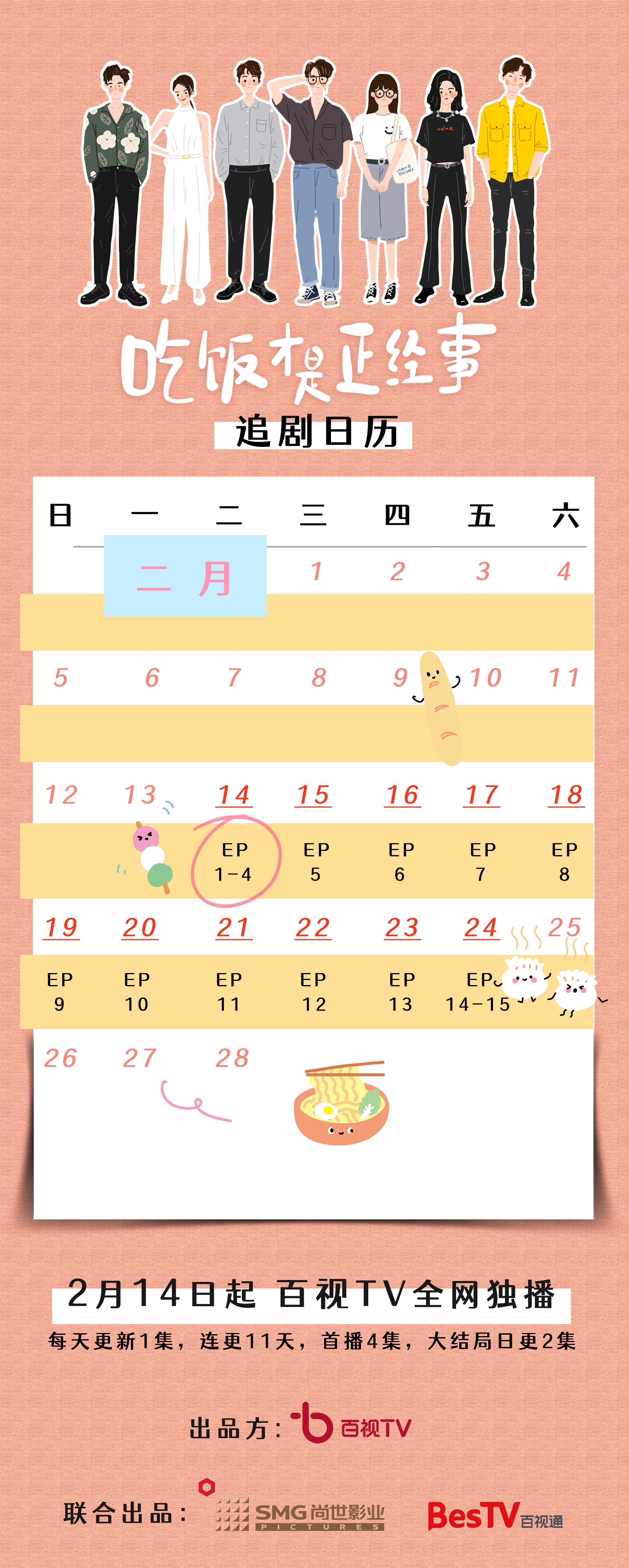 《吃饭才是正经事》于百视TV 2月14日12:00首更四集,连更11天,全剧共15集,7位主角面对各自的情感问题会作何选择?敬请关注。