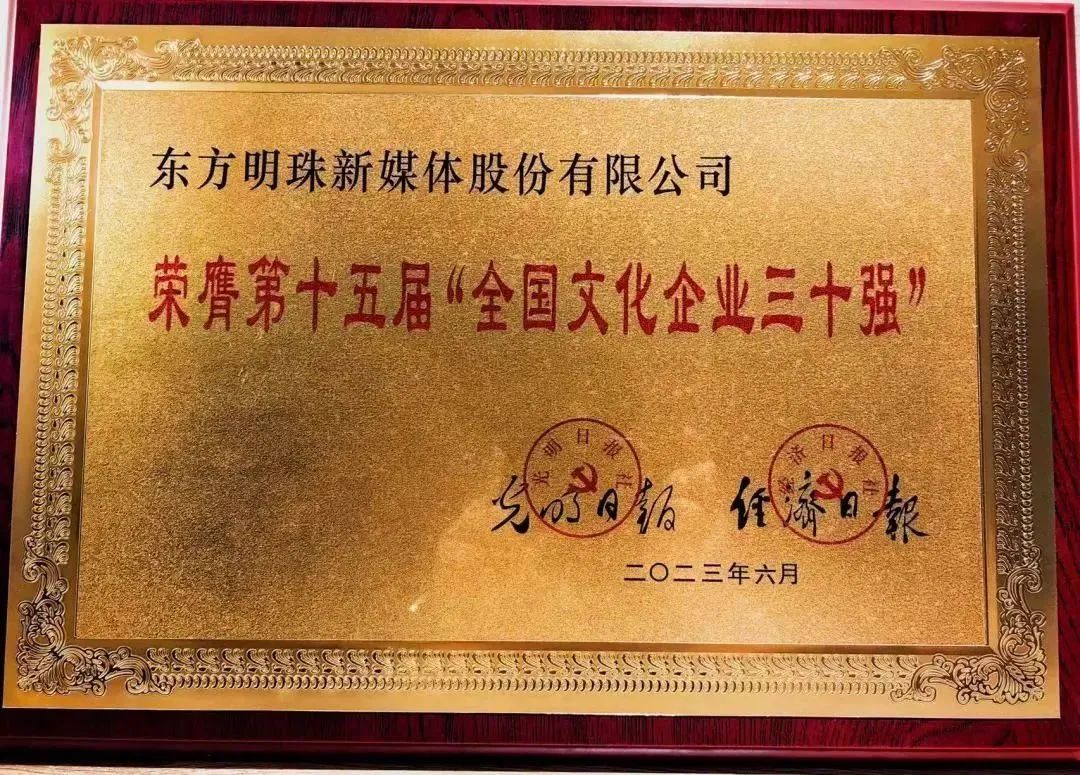 2023年6月7日,第十五届“全国文化企业30强”名单发布,东方明珠新媒体股份有限公司连续第12年荣登榜单。