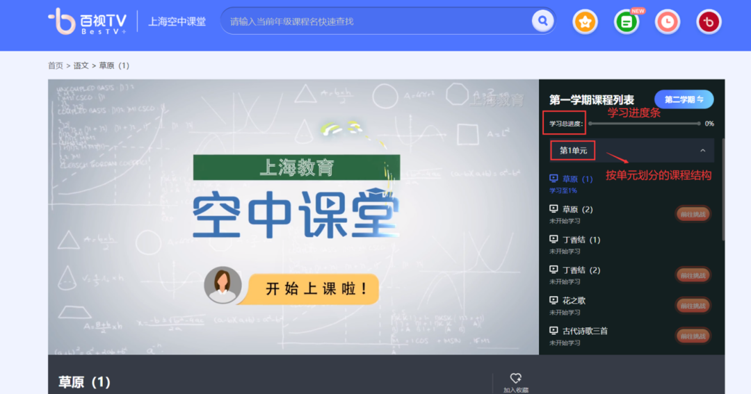第二步:点击科目,进入科目学习页面,课程结构与学生书本教材顺序一致,学生只需输入自己的年级与需要观看的学科,即可查询到所学课程。