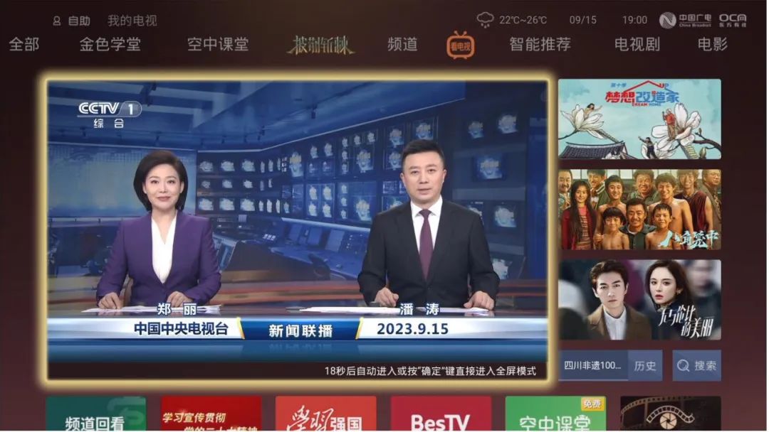 用户开机进入菜单20秒内不进行操作,电视会自动跳转至全屏直播。用户在浏览其他界面的过程中,也可以通过遥控器上的“电视”键一键进直播。