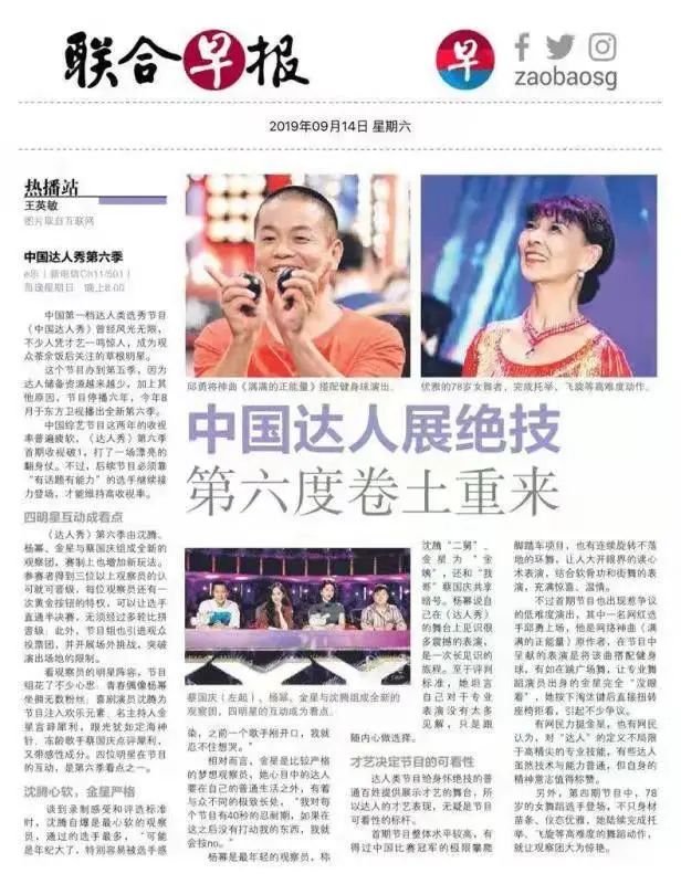 除了在新加坡新媒体平台上建立“视听上海”内容专区外,SMG头部综艺持续在东盟地区扩大播出范围,遍地开花,收视喜人。《我们的歌》《极限挑战》《中国新相亲》《中国达人秀》等节目在新加坡、马来西亚、文莱、泰国等多个国家实现同步跟播,落地新加坡新传媒Mediacorp、Singtel、马来西亚ASTRO、八度空间(8TV)等主流媒体。其中新加坡《联合早报》先后采访了2020年《中国达人秀》嘉宾及2021年《中国新相亲》节目主持人,并整版刊登报道,联动当地播出平台进行立体化宣传,进一步提升了节目在当地的传播影响力。《中国达人秀第六季》和《我们的歌》系列综艺节目凭借在新加坡各大平台的传播表现,荣获“中国-东盟”电视周优秀传播案例奖项。