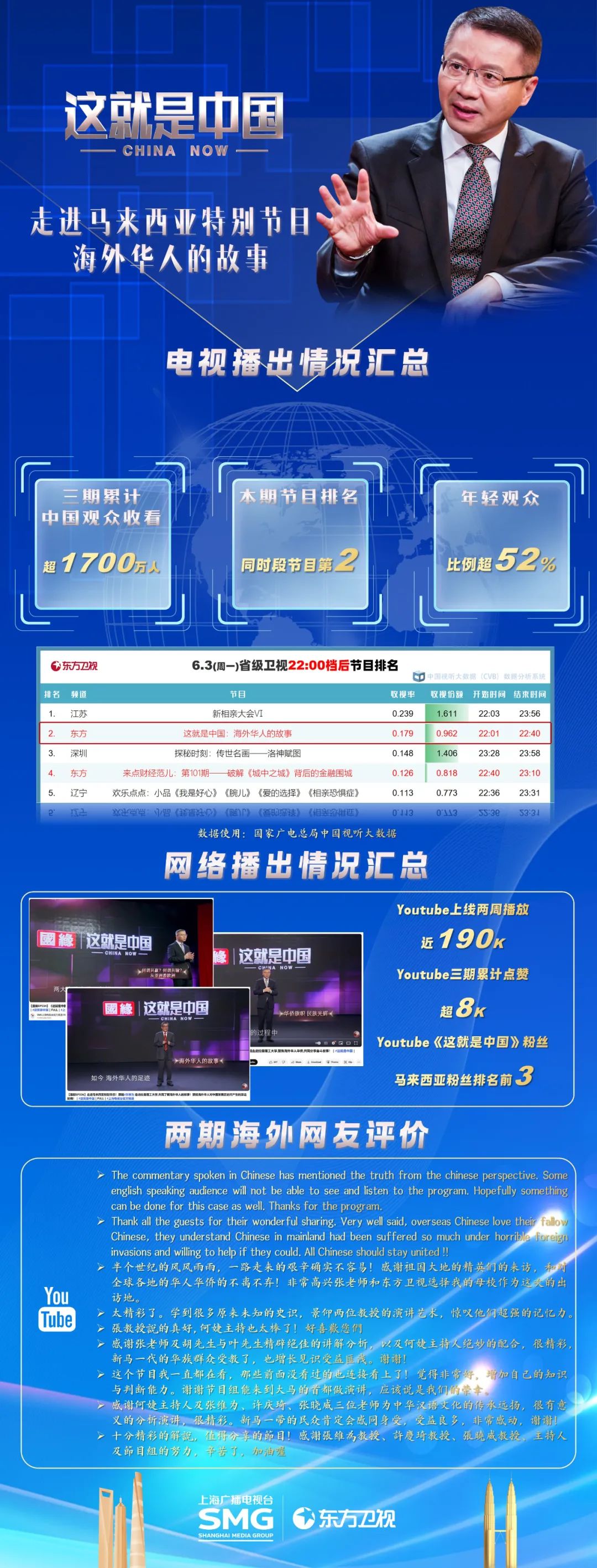 Youtube上的观看次数达16.6万人次,播出后来自马来西亚的粉丝数量增长跃升至前3。有马来西亚观众留言道:半个世纪的风风雨雨,一路走来的艰辛确实不容易!感谢祖国大地的精英们的来访,和对全球各地的华人华侨的不离不弃!非常高兴张老师和东方卫视选择我的母校作为这次的出访地。除此以外,节目在腾讯、微博、观察者网、观视频、搜狐、咪咕视频等网站上,也收获了非常高的关注度与点击率。