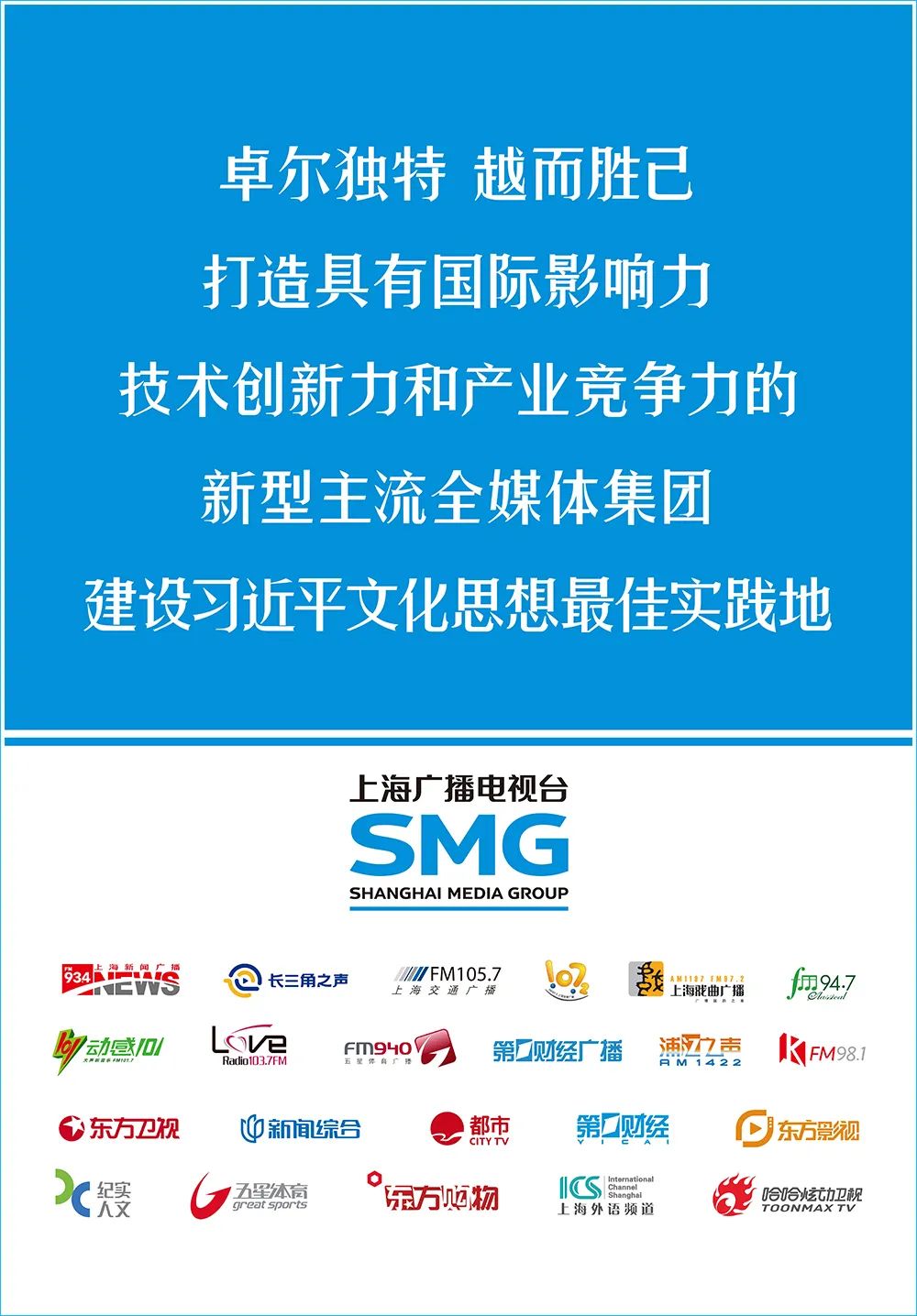 上海广播电视台(上海文化广播影视集团有限公司)是一家具有国际影响力、技术创新力和产业竞争力的新型主流全媒体集团,围绕上海建设习近平文化思想最佳实践地的总目标,坚持意识形态、公共服务和技术产业三大属性,以巩固壮大主流价值、主流舆论、主流文化为主要任务,以“新闻立台、文化兴台、融合强台”为核心战略,以“梦想的力量”为品牌主张,以“SMG in AI”为主攻方向,用AI重构媒体技术底座,大力推进“智能化、超清化、移动化”发展,勇担新的文化使命,增强改革创新勇气,坚定追求卓越,提升核心竞争力,努力打造媒体深度融合高质量发展的全国新样本,在建设具有强大传播力、引导力、影响力、公信力的新型主流媒体上始终走在全国前列,为上海加快建成具有世界影响力的社会主义现代化国际大都市不断作出新贡献。