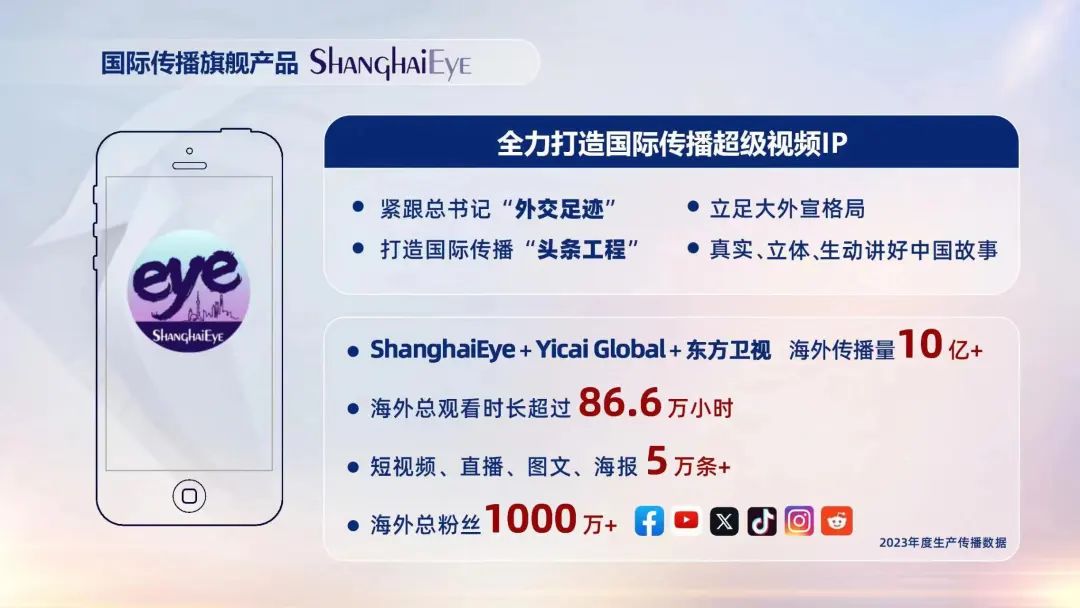 聚合全台优质资源,全力打造由ShanghaiEye、Yicai Global和东方卫视(国际版)组成的国际传播超级视频IP,年度发布视频、直播、图文、海报超过5万条,海外总观看时长86.8万小时,海外传播量突破10亿级。