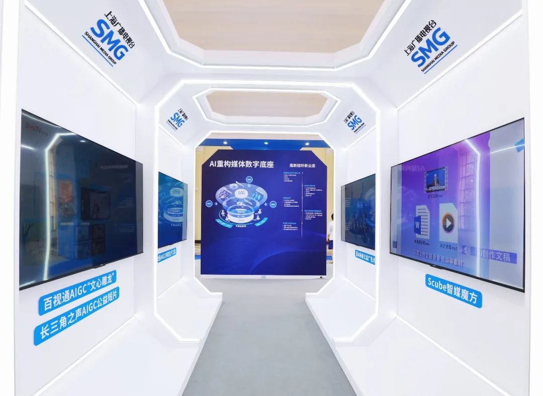 展台现场特设的智能引领区以时空隧道为灵感,精心打造一个充满科技感与未来感的延伸空间,为来宾带来了一场视觉与技术的盛宴。集中展示了AIGC应用集成工具Scube(智媒魔方)、第一财经AIGC模型、百视通AIGC“文心雕龙”、长三角之声AIGC公益短片、中国首部AIGC系列公益广告片《因AI向善》以及超高清8K全景声作品等,吸引来宾们纷纷驻足。