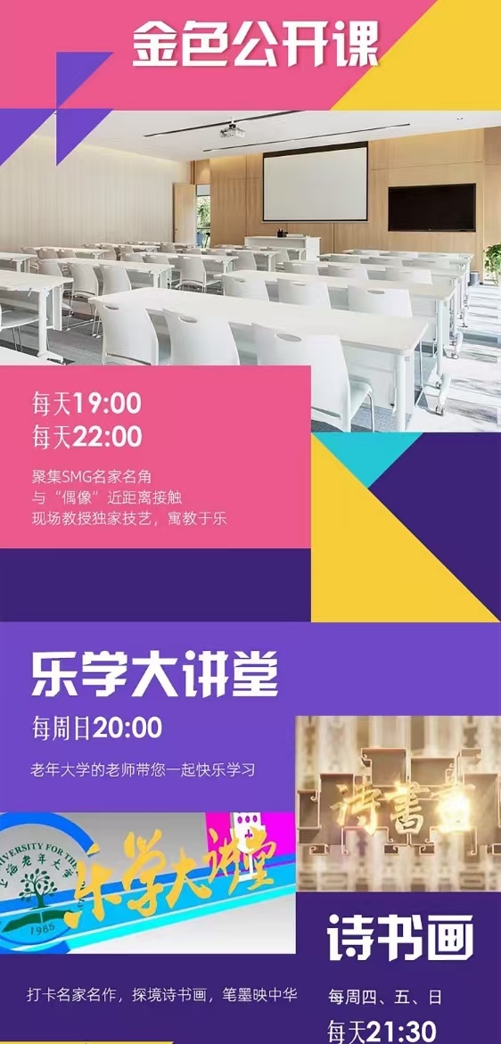 “金色学堂”由上海市教育委员会与上海广播电视台、东方明珠联合推出,是由市教委终身教育处指导、文广互动实施推进的国内首个50+全媒体终身教育平台。“金色学堂”以市教委终身教育资源为基础,以上海广播电视台优质节目为支撑,打造24小时“健康科普、智慧养老、文化娱乐”三大节目带,将以往“一座难求”的老年大学名师名课搬到电视大屏,打造老年人的“空中课堂”。