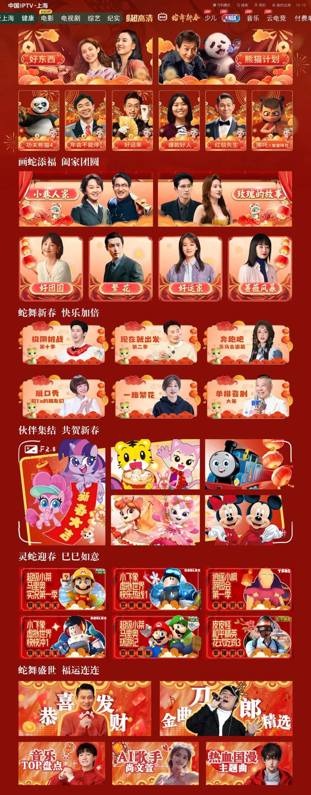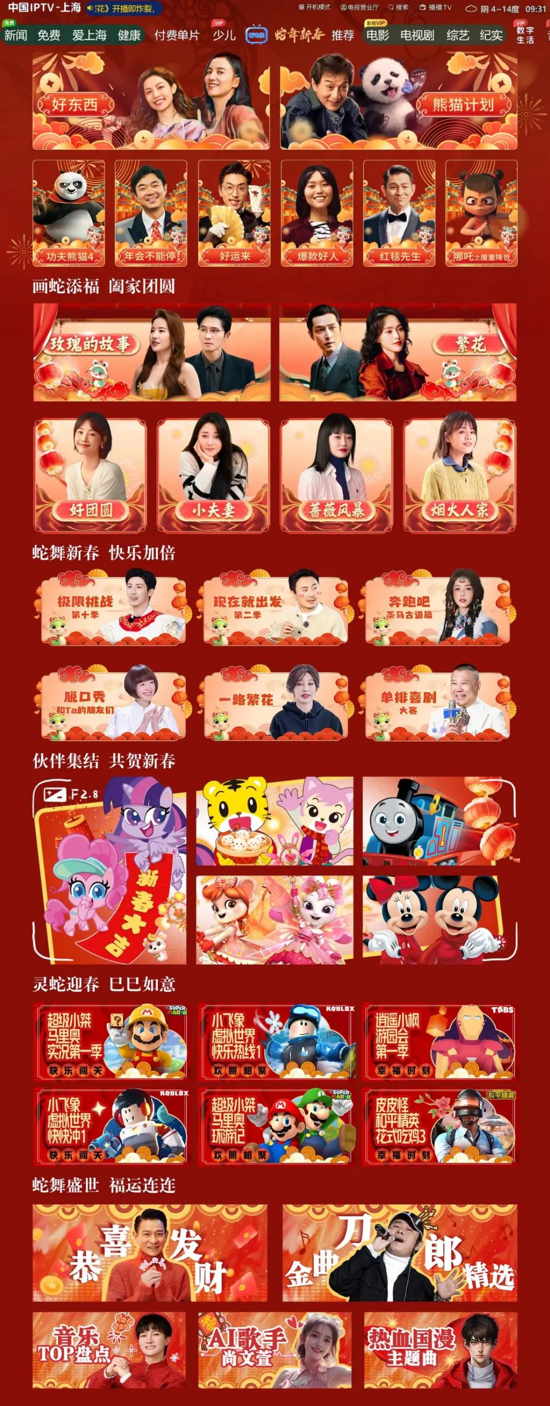 在上海IPTV电影板块,《好东西》《熊猫计划》等华语院线佳作,一起畅享大银幕精彩;电视剧板块精选《好团圆》《玫瑰的故事》等都市题材家庭剧,共同感受家庭的温暖;综艺板块的《一路繁花》《奔跑吧·茶马古道篇》等热综,为您和家人带来欢声笑语;少儿板块的《小马宝莉》《托马斯和他的朋友们》等动漫偶像,让孩子们的春节假期充满乐趣与陪伴;音乐板块特别呈现《恭喜发财》等经典金曲,以熟悉的旋律唤醒儿时街头巷尾的欢腾记忆,一同欢喜迎新春。