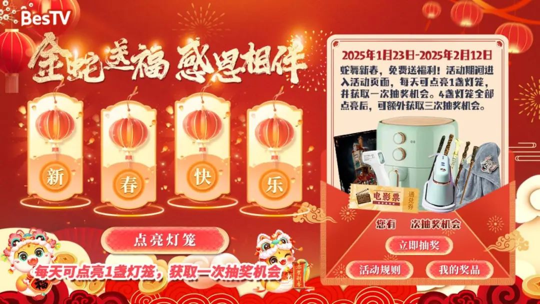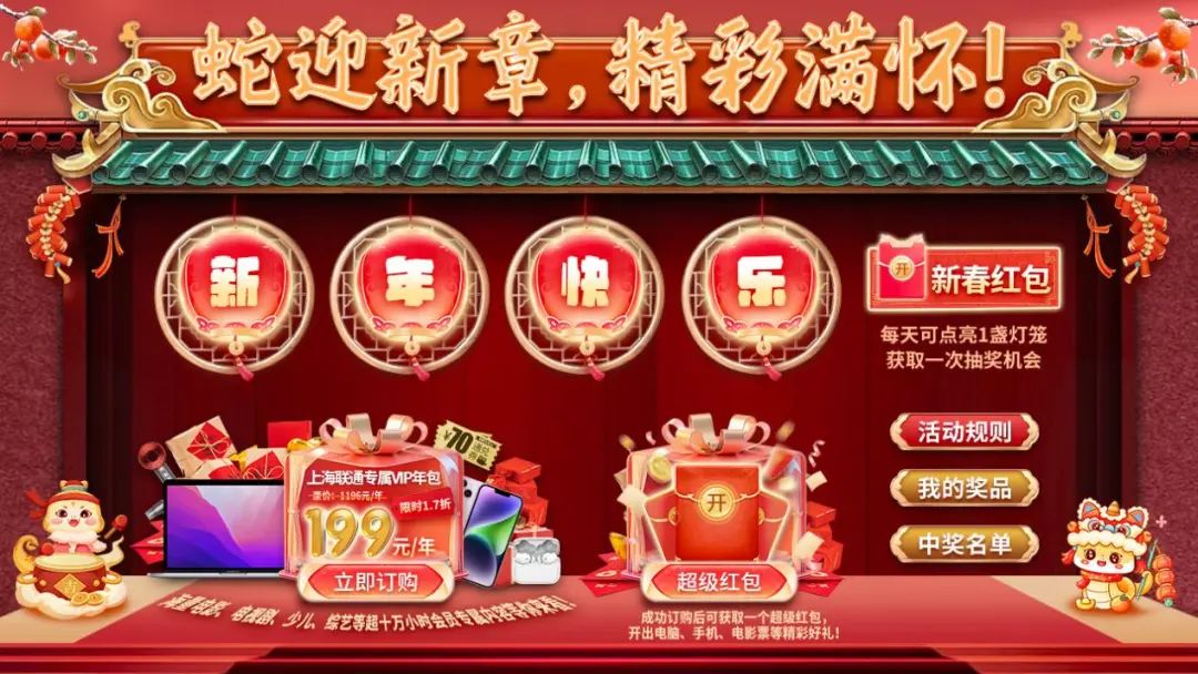 2025年1月24日-2025年2月5日期间,上海联通IPTV用户可通过点亮“新春快乐”灯笼免费获取新春红包,最多可获得7个红包。奖品有电脑、手机、吹风机、蓝牙耳机、电影票等超值礼品。若订购活动产品额外可获取一个超级红包,每个红包均有机会开出惊喜。