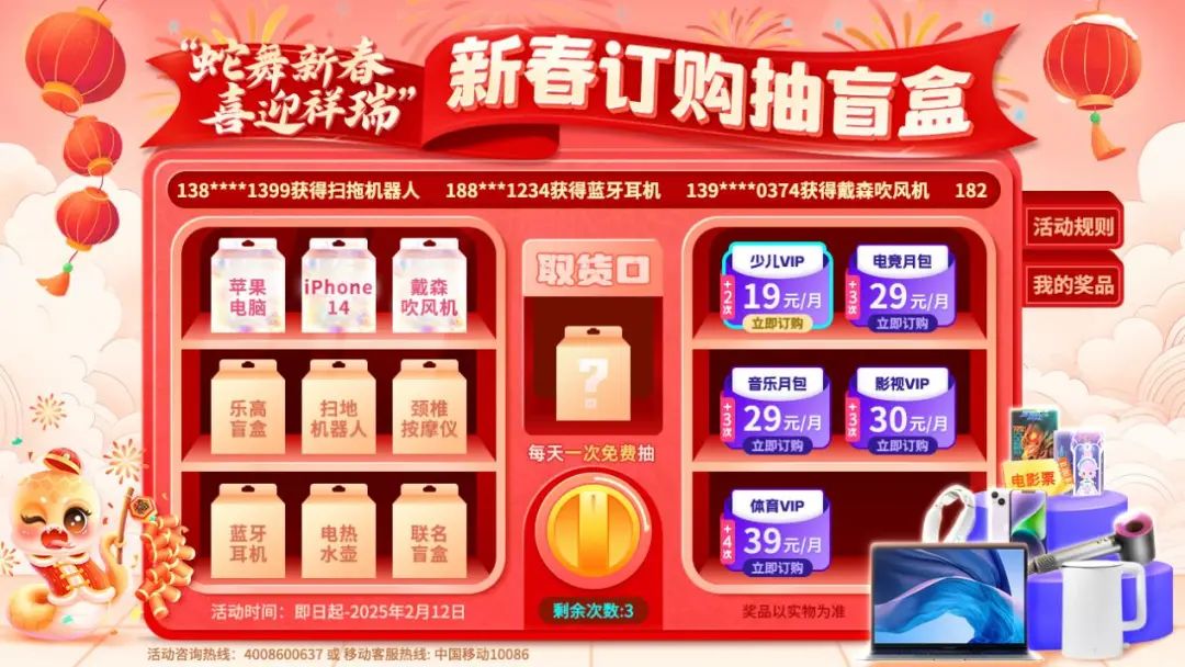 2025年1月22日-2025年2月12日期间,上海移动IPTV用户每日享1次免费开盲盒机会。奖品有电脑、手机、扫地机器人、玩具盲盒等多重好礼。新订购指定增值产品包,可额外获得对应抽奖机会。