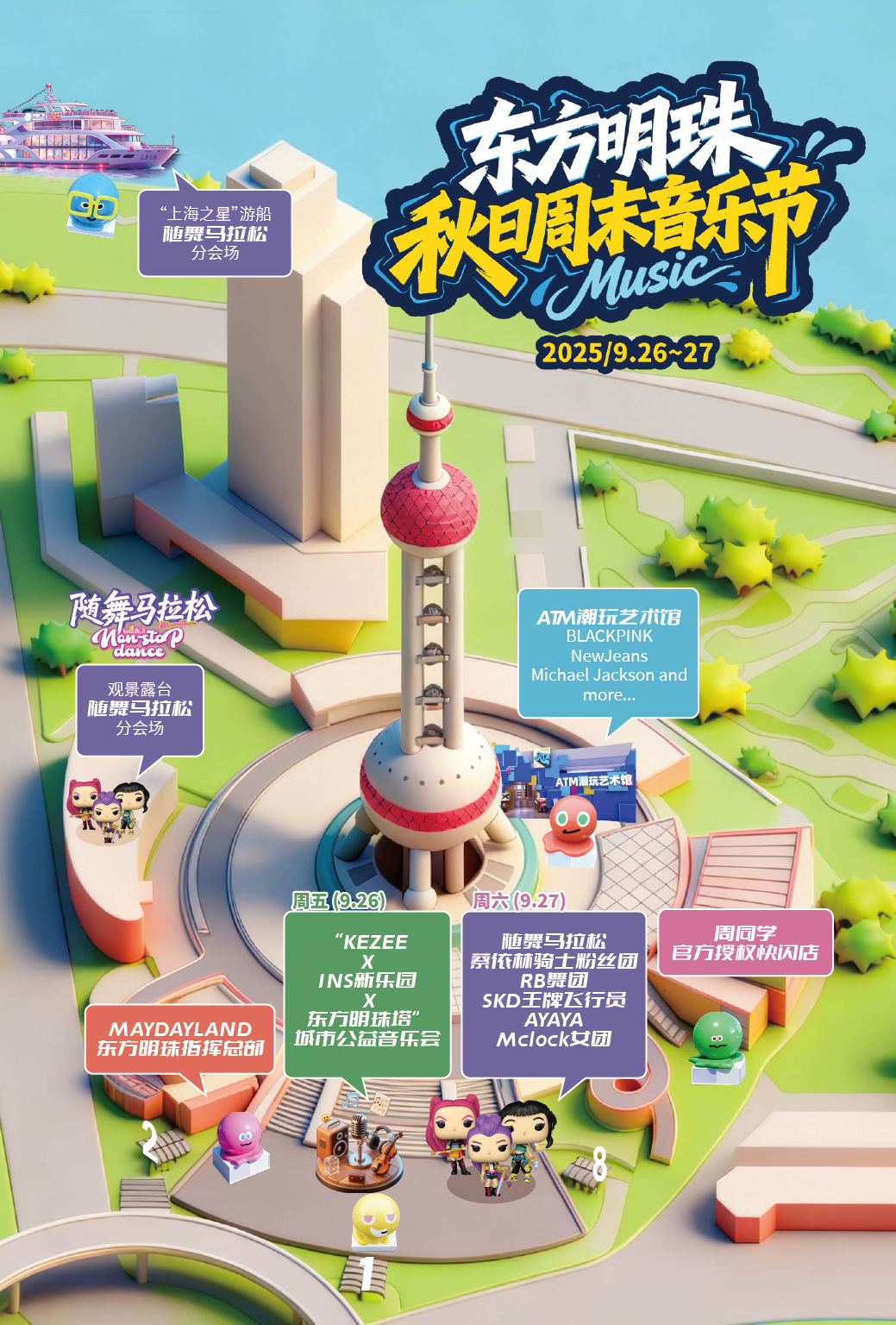 9月26日至27日,东方明珠塔“秋日周末音乐节”将打造旅游节最潮打卡地:携手KEZEE,让您在明珠光影中感受顶级LIVE HOUSE火热氛围;全国首个地标级6小时“随舞马拉松”热力开蹦,200+社团不卷舞技只卷快乐;更有MAYDAYLAND东方明珠指挥总部快闪活动、周同学官方授权快闪店、ATM潮玩艺术馆惊喜同框,锁定你的心水周边、限定福利与专属徽章!