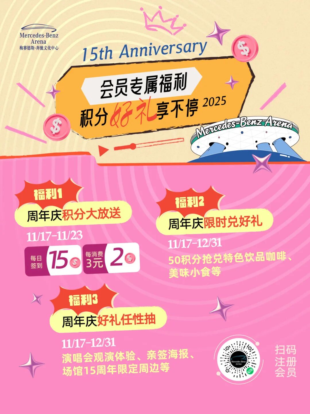 除线下狂欢外,梅奔中心同步推出十五周年会员专属线上福利:积分翻倍、折扣兑换、限时抽奖等权益持续放送。更有“每周送亲签”惊喜彩蛋——每周三至周五,关注@梅赛德斯-奔驰文化中心 小红书官方账号,即有机会获得艺人亲签海报,延续粉丝与舞台的情感联结。